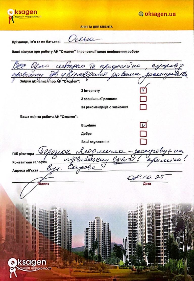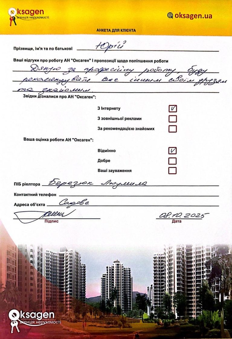 Задоволений роботою АН «Оксаген» та мого ріелтора Березюк Людмили, вона допомогла мені з пошуком та оформленням покупки квартири. Все швидко та на найвищому рівні.