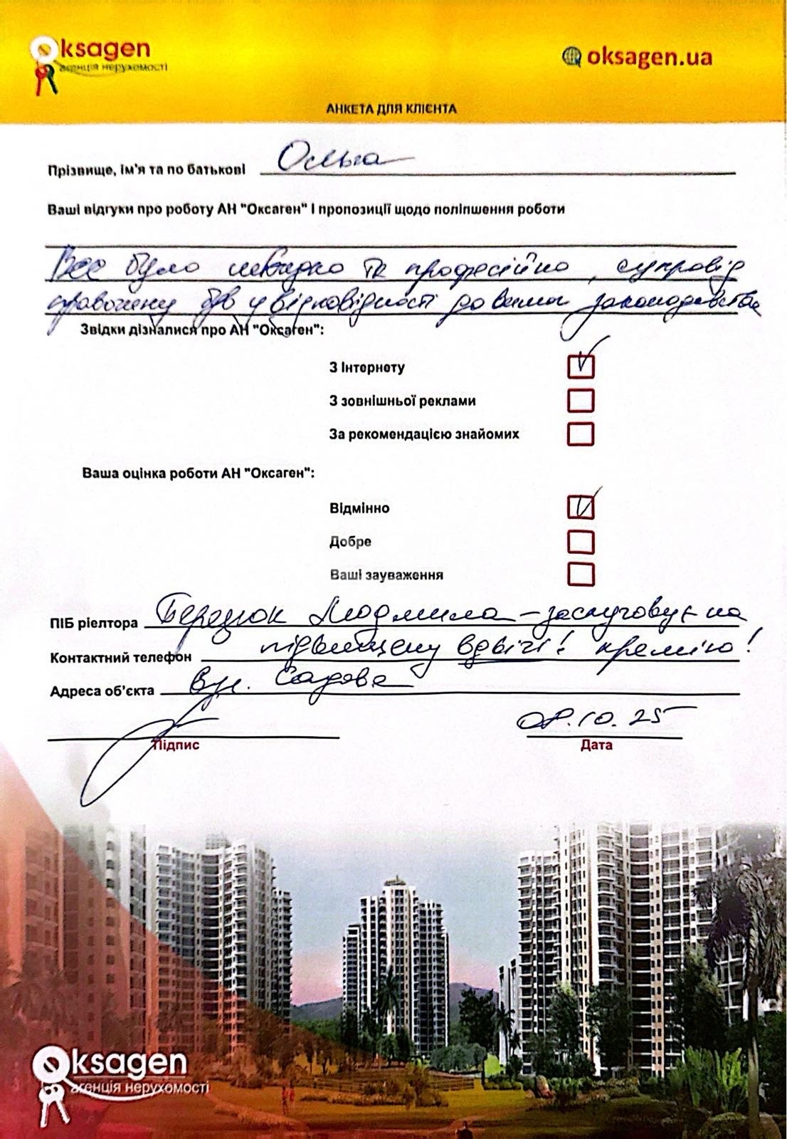 Раджу АН Оксаген, а саме ріелтора Людмилу БерезюкЙ Дякую за пошук та поміч в придбанні нерухомості!