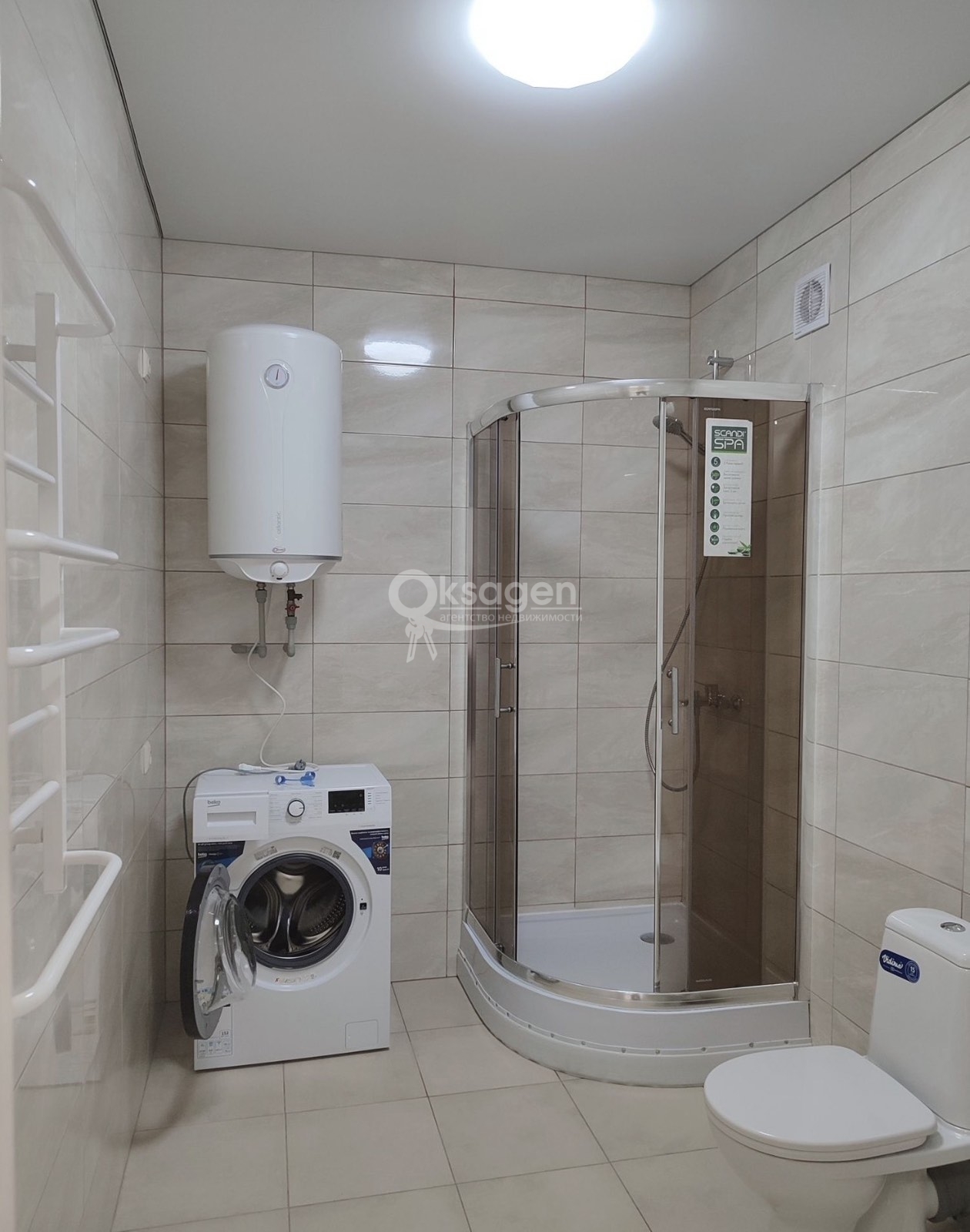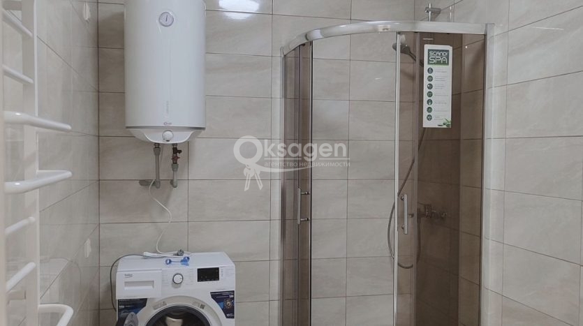 Є все необхідне: пральна машина, бойлер, холодильник, кухня, стіл та стільці, душова кабіна, диван, шафа-купе, варильна поверхня, духова шафа, чайник, індивідуальне електроопалення.